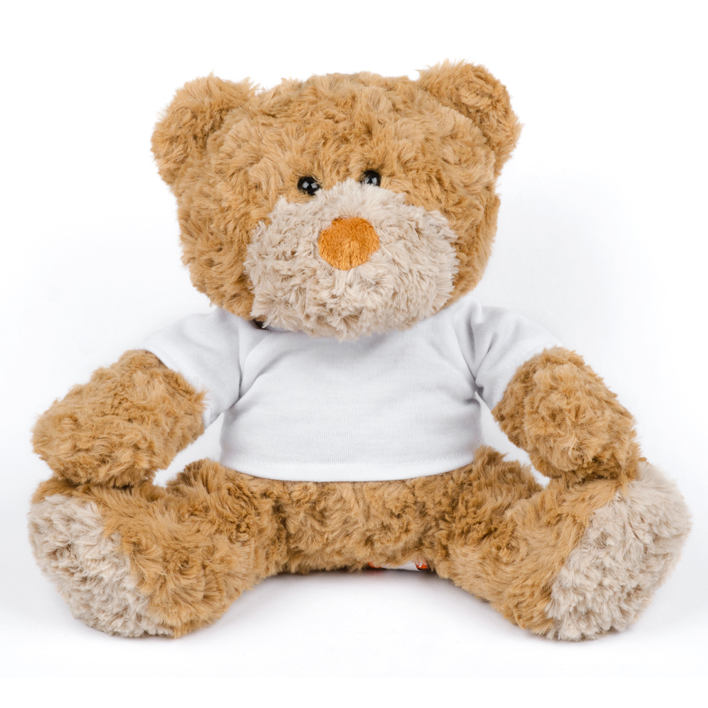 Plyšový medvedík v bielom tričku určenom na sublimačnú potlač. Hebky a mäkký plyš. Je možné zakúpiť aj bez potlače. Výška hračky v sede je 23 cm. Vhodná ako vtipný alebo romantický darček k Valentínu, k narodeninám či k Vianociam, pre partnera, alebo deti.